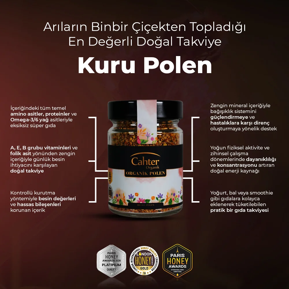 Cahter Organik Arı Poleni, doğallığını koruyan yapısıyla günlük vitamin ve mineral ihtiyacınıza katkı sağlar.