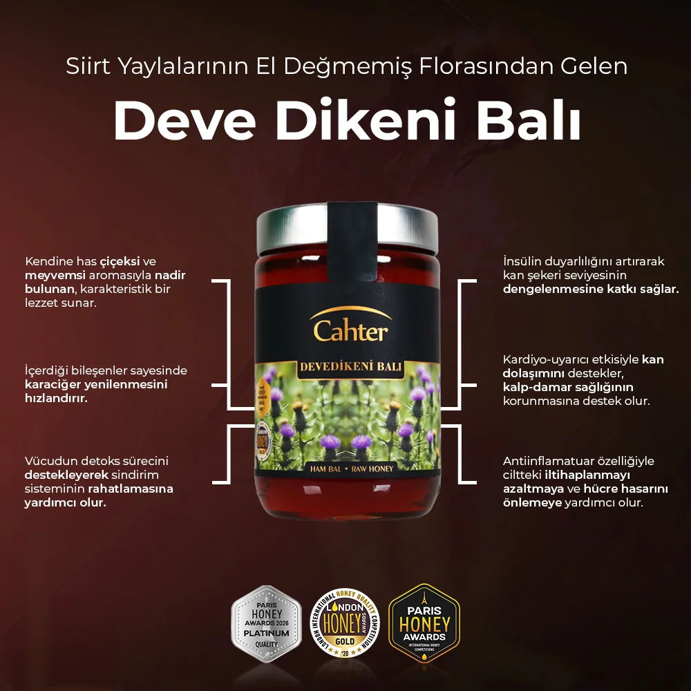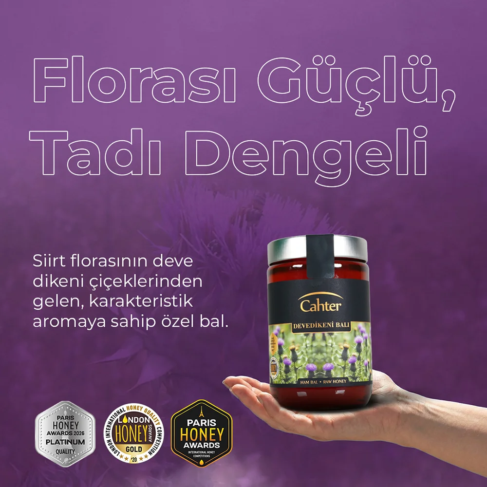 Cahter Organik Deve Dikeni Balı, doğadan gelen karakteristik lezzetiyle yüksek kaliteyi arayanlar için özenle hazırlanır.