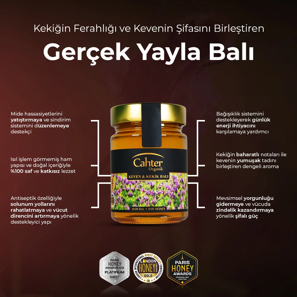 Cahter Organik Keven Kekik Balı, yüksek rakımlı yaylaların doğal florasını yansıtan saf aroması ve berrak yapısıyla gerçek bal deneyimi sunar.
