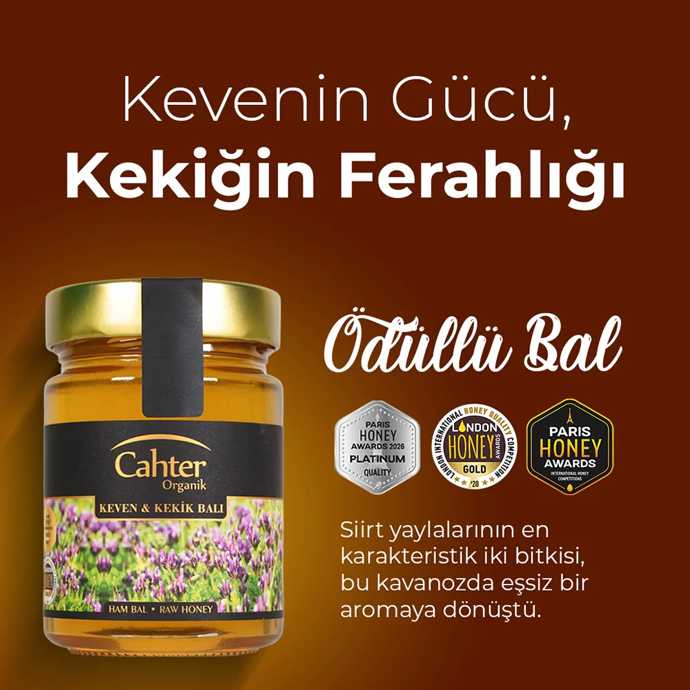 Cahter Organik Keven Kekik Balı 450 g, yüksek yaylalarda açan keven ve kekik çiçeklerinin nefis nektarını bir araya getirerek yoğun aromalı, doğal ve karakteristik bir lezzet sunar.