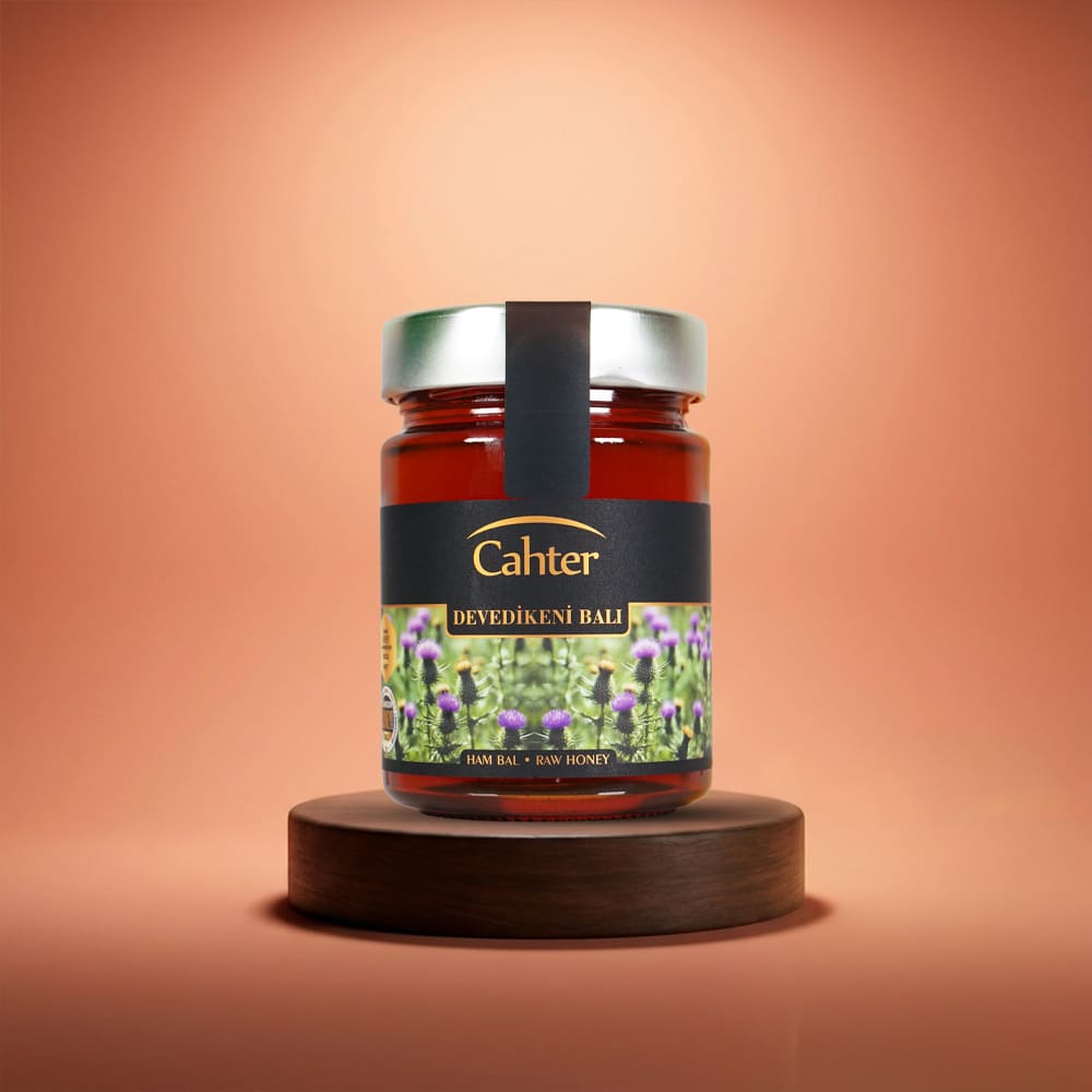 Milk thistle honey is a monofloral honey variety produced from the nectar of milk thistle flowers that bloom during the summer months. Bees collect nectar from these blossoms and transform it into honey within the hive. The natural flora of the regions where milk thistle grows gives this honey its distinctive aroma, deep color, and naturally dense texture.